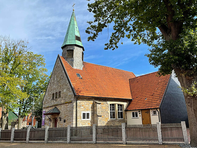 Anstelle eines Turms ist sie mit einem Dachreiter ausgestattet, in dem sich das Geläut befindet.